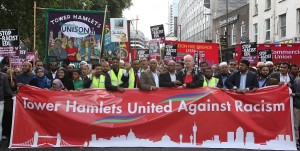 Fighting Islamophobia in practice: Mayor Lutfur Rahman leads a united opposition to the English Defence League, 2013.