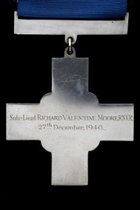 George Cross medal on blue ribbon. Front 'For Gallantry'. Back Inscribed 'Sub-Lieut RICHARD VALENTINE MOORE R.N.V.R. 27TH December, 1940'